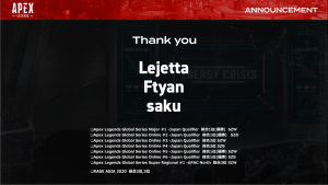 Lejetta選手はSCARZ Whiteとして活動をスタート後、最初の大型オンライン大会となる「Apex Legends Global Series -Online Tournament#1」にてリーダーとしてチームを優勝に導き、Apex部門の軸を創って下さいました。